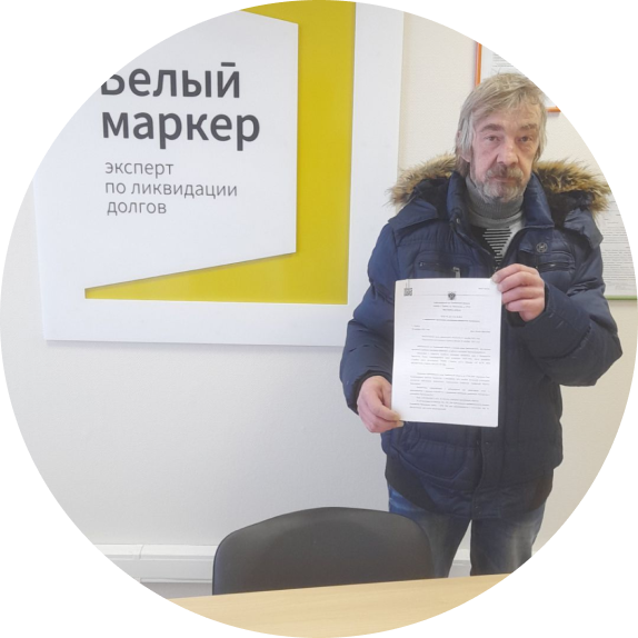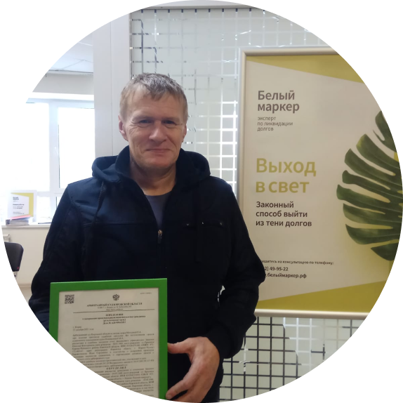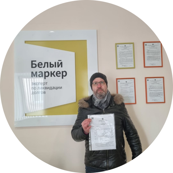 «Основной причиной моего долга стала пандемия, перекредитованность и потеря дохода. Из рекламы я узнал о компании Белый маркер. Работники компании - грамотные специалисты. Внимательные, все доходчиво объясняют. Всегда во время процедуры успокаивали, поддерживали. Очень им благодарен, большое спасибо им. Они сделали очень огромную работу! В результате их работы у меня все получилось и меня признали банкротом. Всем знакомым я советую в таких ситуациях обращаться в компанию Белый маркер»