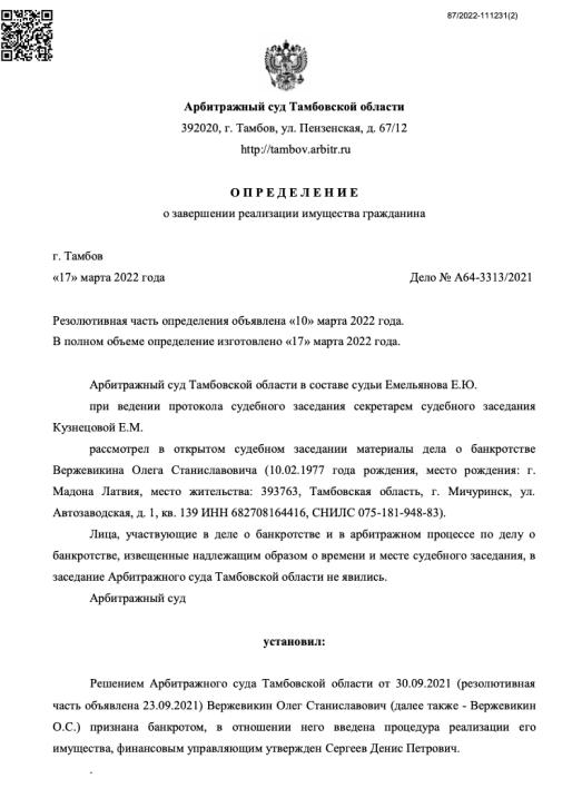 «Я выбрал фирму Белый маркер совершенно случайно и не ошибся, и не пожалел о своем выборе. Самым важным в выборе компании в моем случае – было проведение экспертизы. Мне очень понравилась оперативная работа сотрудников филиала в г. Мичуринске. Быстрое оформление документов для передачи в Арбитражный суд г. Тамбова. На всех этапах работы специалистов Белого маркера у меня ни разу не было сомнений в успешном завершении процедуры банкротства. Я очень доволен результатом. Вернулось чувство финансовой свободы и независимости. Если, в случае возникновения похожих на мою проблем, знакомые спросят меня о банкротстве, то обязательно посоветую Белый маркер.»