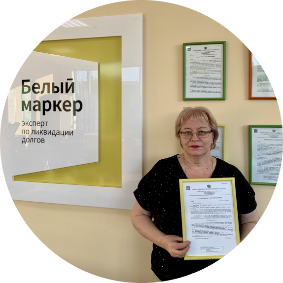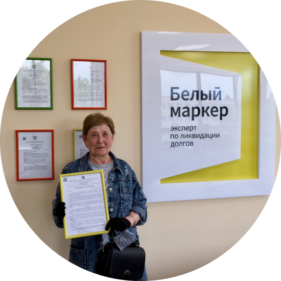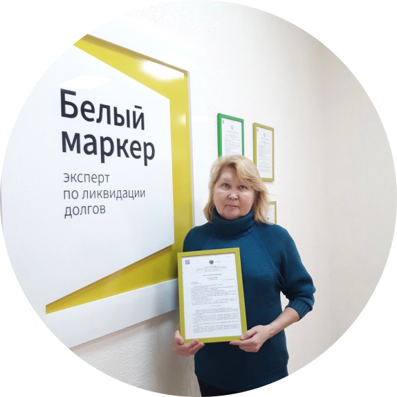«Получала пенсию, работала, пока не началась пандемия из-за вируса. Взяла кредит, работу потеряла, платить стало нечем, т.к. пенсия минимальная. Вот и пришлось обратиться к ликвидации долгов. Прочитала в интернете про Белый маркер, меня пригласили на консультацию. Работают очень хорошие сотрудники и все хорошо объясняют. Мне это очень понравилось! Я переживала вдруг что-то пойдет не так, но все обошлось. Сотрудники все делали сами, и мне ничего не надо было делать. Результат в итоге отличный и долг списан! Я очень довольна и буду рекомендовать своим знакомым, друзьям. Большое спасибо!»